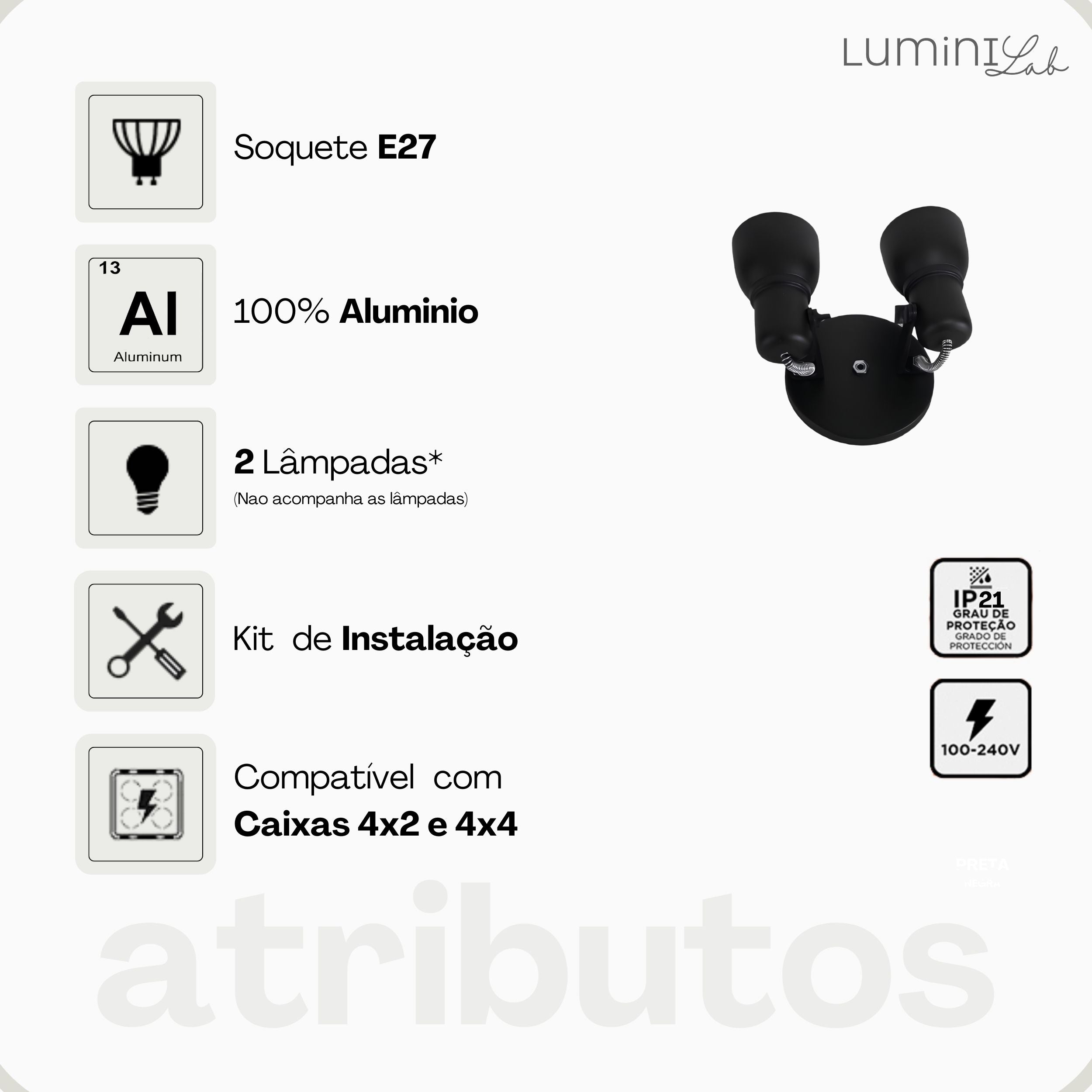 Spot Light Aluminio Teto E27 2 Luzes Lumini Lab
